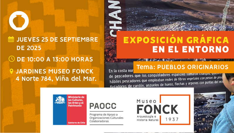 El Museo Fonck invita a participar en una exposición gráfica dedicada a los Pueblos Originarios, gratuita y presencial, que se llevará a cabo el jueves 25 de septiembre de 2025, entre las 10:00 y las 13:00 horas, en sus dependencias, ubicadas en 4 Norte 784, esquina 1 Oriente, Viña del Mar.
