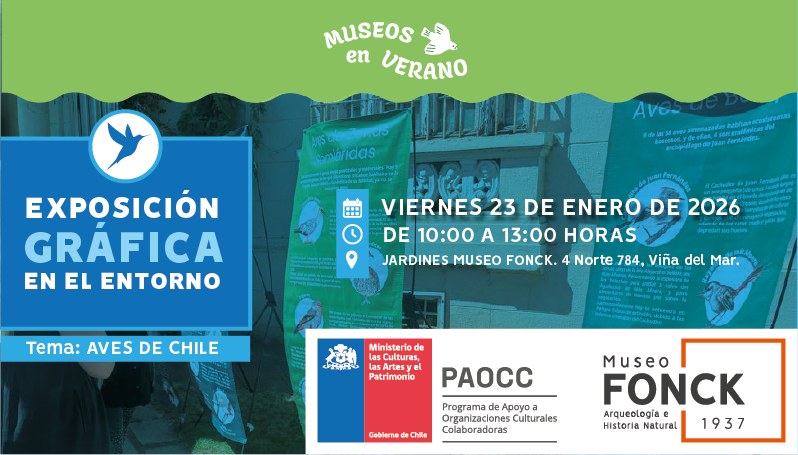 El viernes 23 de enero de 2026, desde las 10:00 hasta las 13:00 horas, el Museo Fonck, ubicado en 4 Norte 784, esquina 1 Oriente, Viña del Mar, llevará a cabo gratis una exposición gráfica en el entorno dedicada a las aves de Chile.
