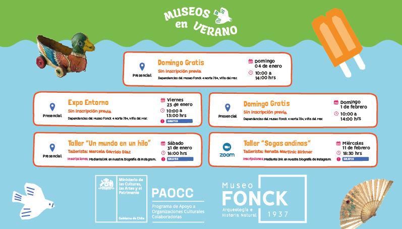 Durante el mes de enero, el Museo Fonck, ubicado en 4 Norte 784, esquina 1 Oriente, Viña del Mar, llevó a cabo diferentes actividades en el marco de la iniciativa Museos en Verano, entre las que destacaron la entrada liberada el primer domingo del mes y una exposición gráfica en el entorno dedicada a las aves de Chile. Además, el sábado 31 de enero de 2026, a las 11:00 horas, se realizará el taller de figuras de hilo “Un mundo en un hilo: descubriendo el patrimonio de la tradición oral”.